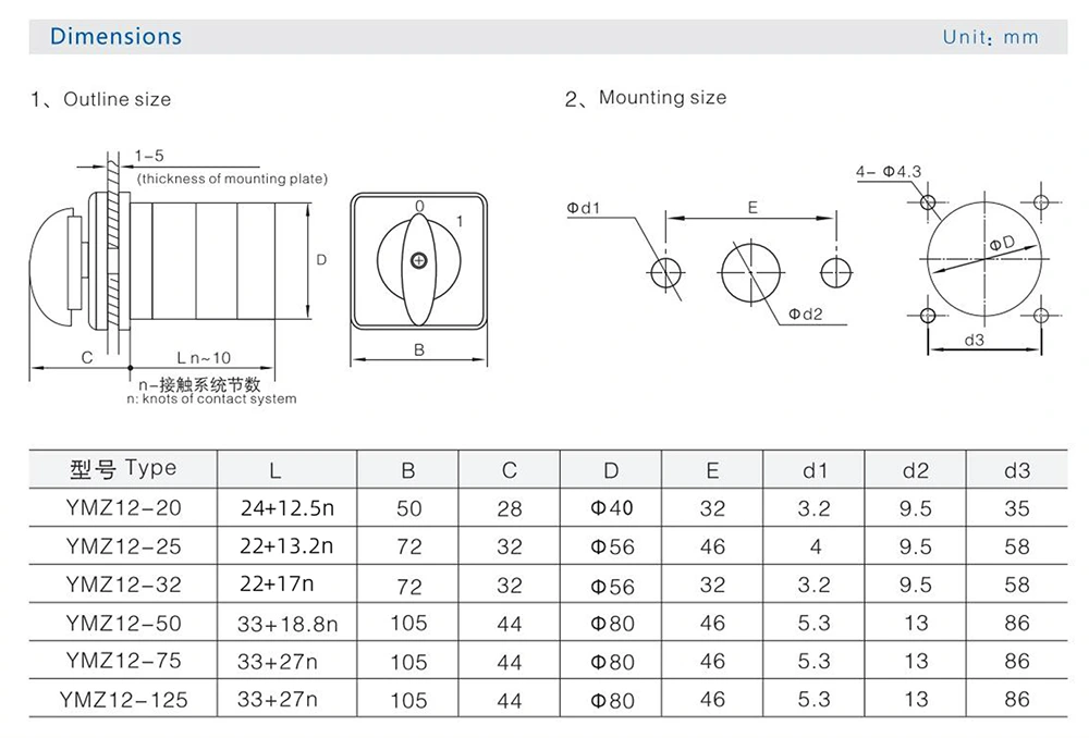 Dengan lebih daripada 30 tahun pengalaman profesional, Zhejiang Yaming Electric ialah pengeluar terkemuka bagi suis elektrik premium, disokong oleh keupayaan teknikal yang kukuh dan sistem pengurusan kualiti yang komprehensif. Suis Cam Rotary Gabungan Tiga Kedudukan 125A kami LW31 (kod dalaman: YMZ12-125), menyepadukan ketukangan yang indah dan teknologi canggih, serta dilengkapi dengan fungsi anti-salah operasi untuk menyampaikan kawalan litar yang stabil dan cekap.