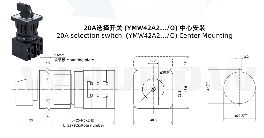 - Kedudukan Fleksibel & Konfigurasi Lapisan: 20A Lubang Tengah Dipasang Memanjangkan Pelbagai Kedudukan Cam Suis menyokong sehingga 12 kedudukan operasi dan 1 hingga 12 lapisan suis, yang boleh disesuaikan mengikut keperluan sebenar peralatan untuk memenuhi senario kawalan yang kompleks.
