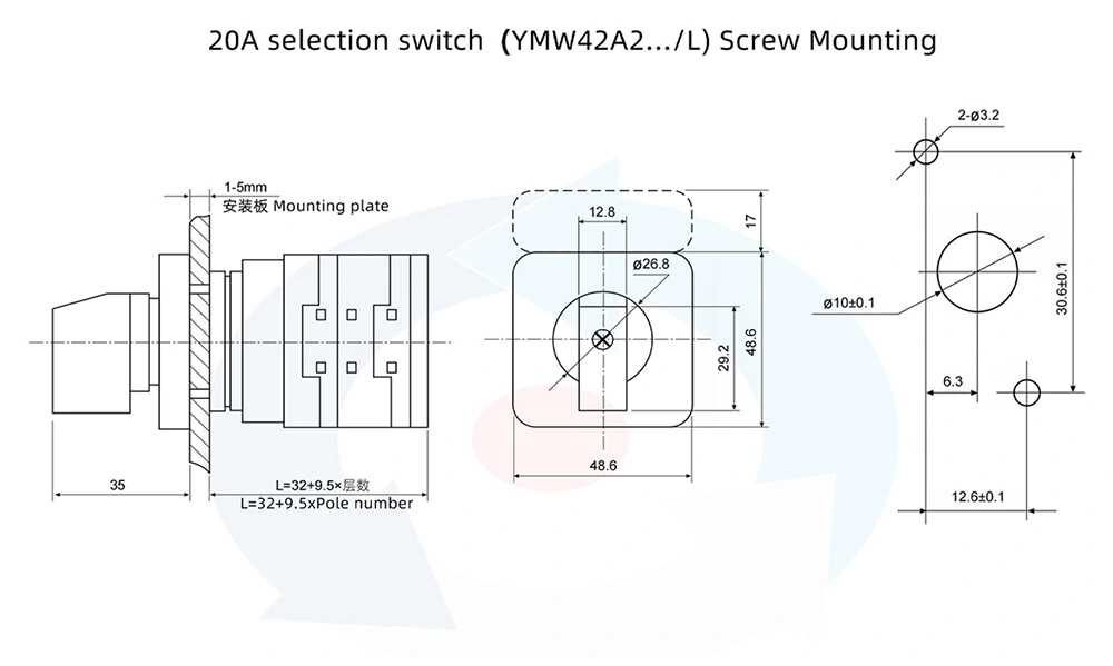 YAMING 20A Multiple Position DIN Rail Mounting Cam Switch ialah komponen kawalan elektrik berprestasi tinggi yang disesuaikan untuk kawalan litar yang tepat. Direka dengan pelekap rel DIN, ia membolehkan pemasangan yang mudah dan cekap, menyesuaikan diri dengan keperluan susun atur padat peralatan elektrik moden. Suis ini digunakan secara khusus untuk AC 50Hz, 690V dan ke bawah alat mesin kawalan program CNC dan peralatan elektrik, memainkan peranan penting dalam gelung kawalan elektrik.